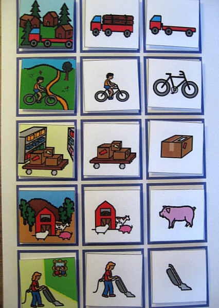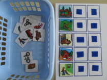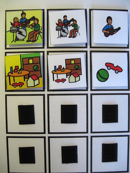 Die Mappe ist aus laminiertem weißem Karton und auf der linken Innenseite befinden sich 6 Einstecktaschen mit 6 unterschiedlichen Pictogrammen darauf.